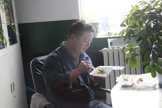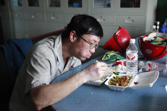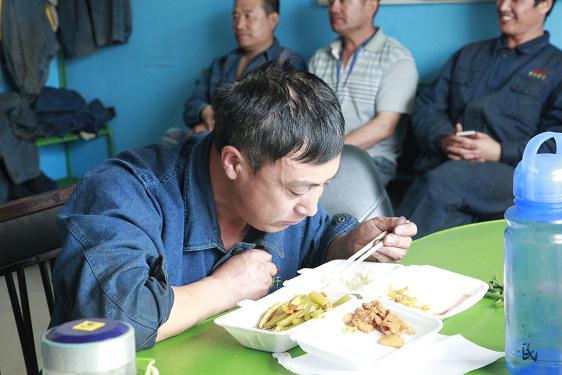 西紅柿炒雞蛋、燒茄子、土豆塊……不定時(shí)地還有魚、雞腿、紅燒肉等等。飯菜雖簡單,但對于忙碌了一個(gè)早上的他們來說,卻非常美味,吃起來一副狼吞虎咽的樣子。此刻,也許山珍海味,也許滿漢全席,都略顯的失色。