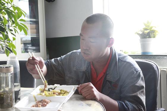 西紅柿炒雞蛋、燒茄子、土豆塊……不定時(shí)地還有魚、雞腿、紅燒肉等等。飯菜雖簡單,但對于忙碌了一個(gè)早上的他們來說,卻非常美味,吃起來一副狼吞虎咽的樣子。此刻,也許山珍海味,也許滿漢全席,都略顯的失色。